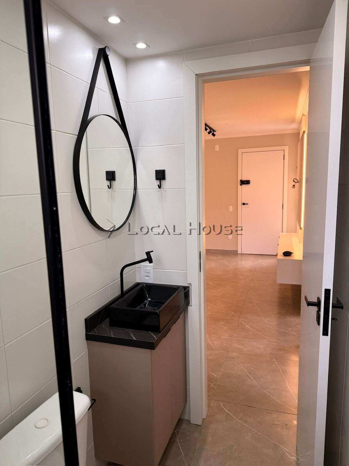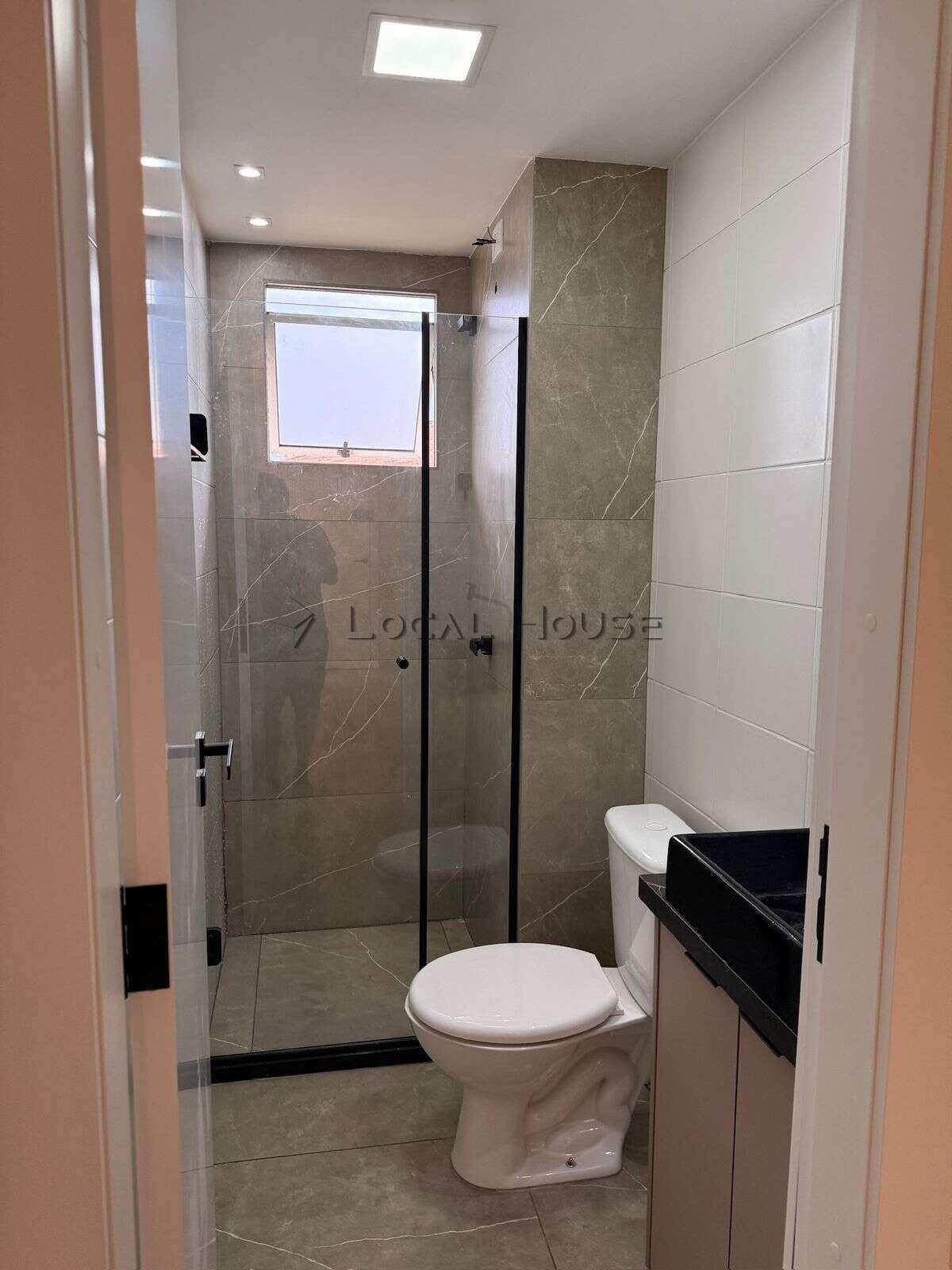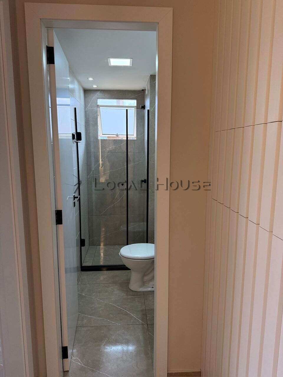 Banheiro com armário planejado e box de vidro